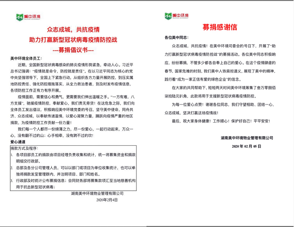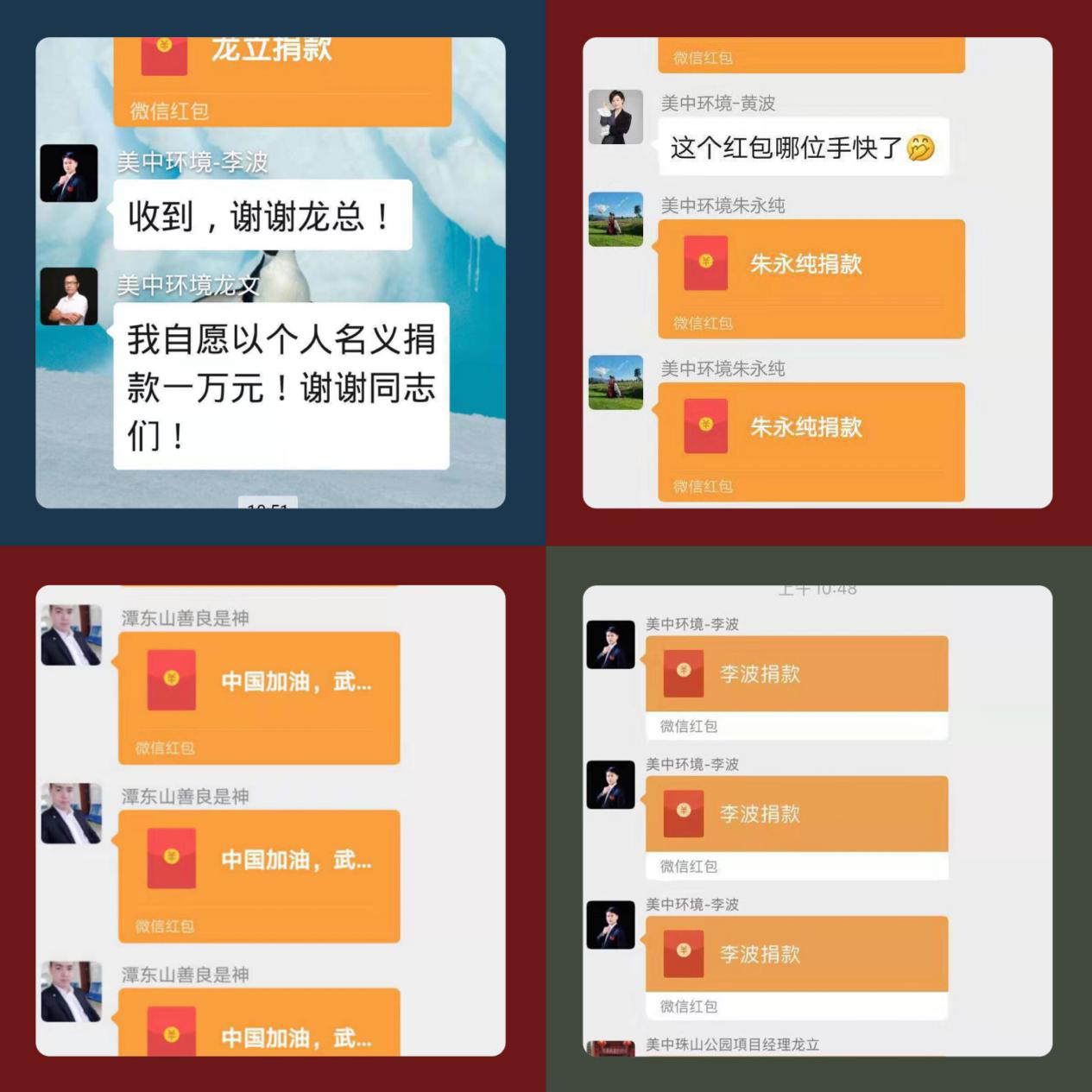 一方有難,八方支援,點滴匯聚,愛心汪洋。自從全國新型冠狀病毒感染的肺炎疫情發生后,在以習近平同志為核心的黨中央堅強領導下,全國上下緊急行動,疫情的每一個進展都深深牽動著每一個中國人的心。在美中環境黨委積極響應與組織下,公司向全體員工發出了《美中環境抗擊疫情募捐倡議書》,倡議美中環境全體員工積極為前線抗疫募捐,讓每一位員工的綿薄之力匯集成愛的海洋輸送到抗疫前線。